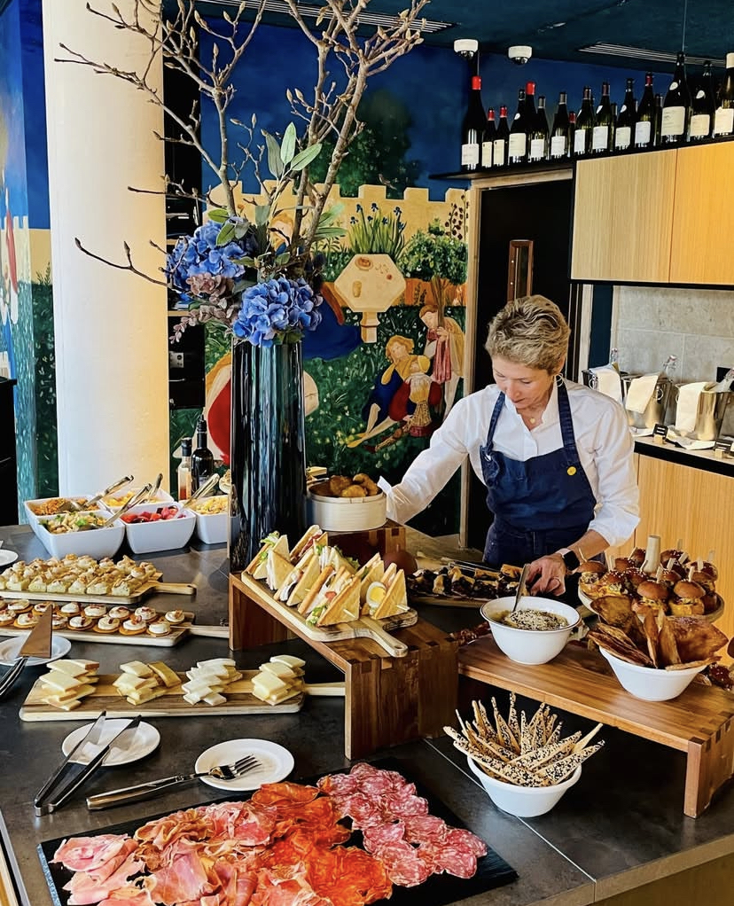 L'expérience se prolonge dans le grand salon ouvert de l'hôtel, où le bar coloré crée un espace de convivialité idéal pour échanger et déguster, notamment les vins de Bourgogne, avant de passer à table.
