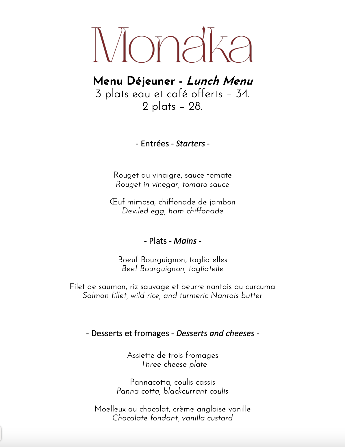 Notre menu déjeuner est disponible du lundi au samedi midi. Ce menu est susceptible de changer selon les saisons et l'inspiration de notre cheffe.