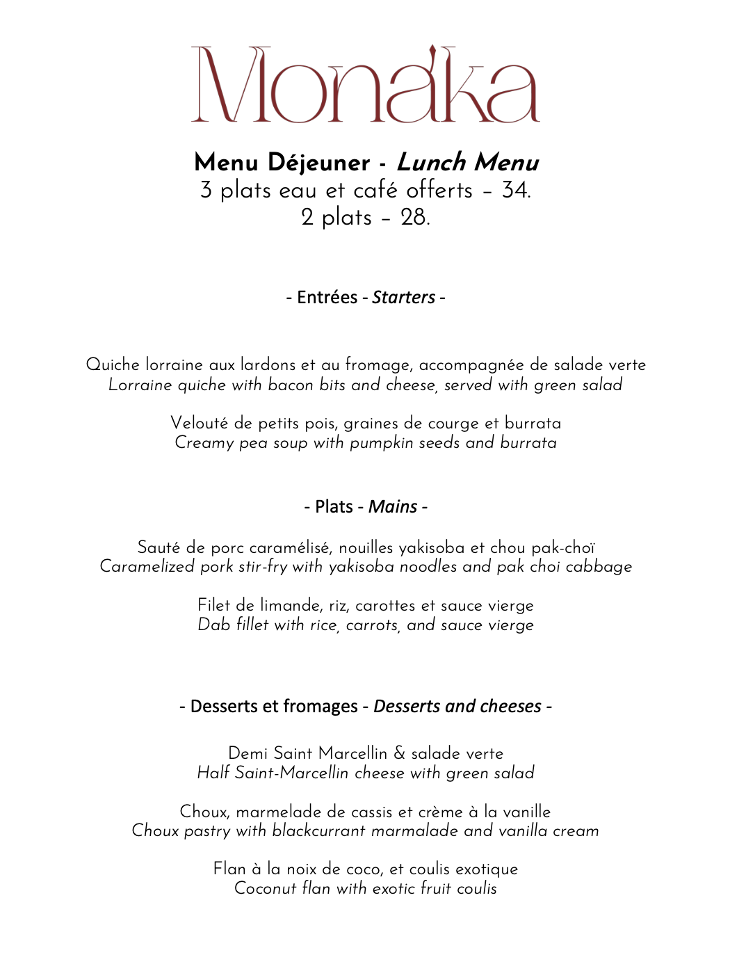 Notre menu déjeuner est disponible du lundi au samedi midi. Ce menu est susceptible de changer selon les saisons et l'inspiration de notre cheffe.