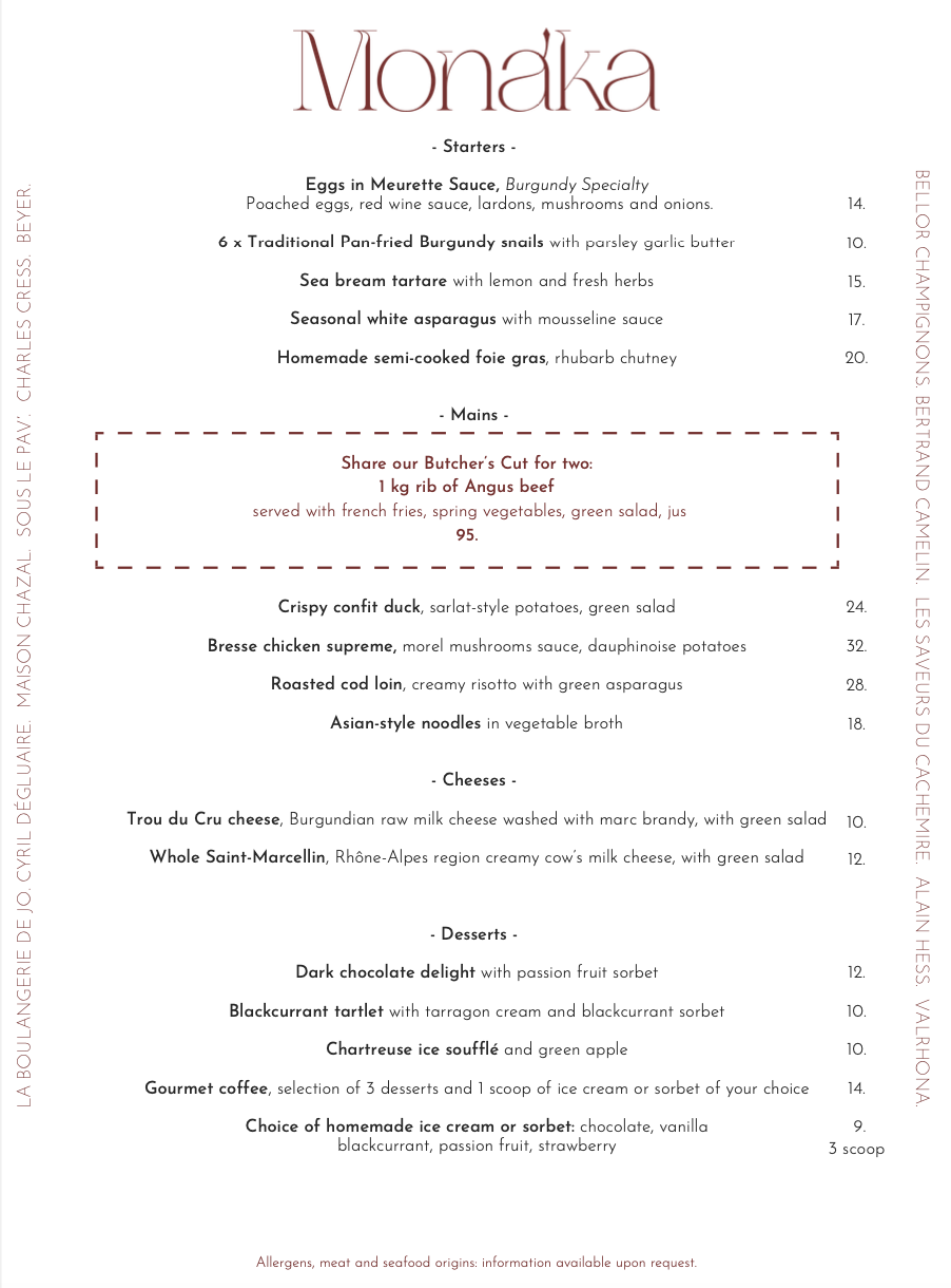 Our lunch menu is available from Monday to Saturday lunchtime, featuring seasonal dishes inspired by our chef's creativity. Please note that the menu is subject to change based on seasonal availability and the chef's inspiration.